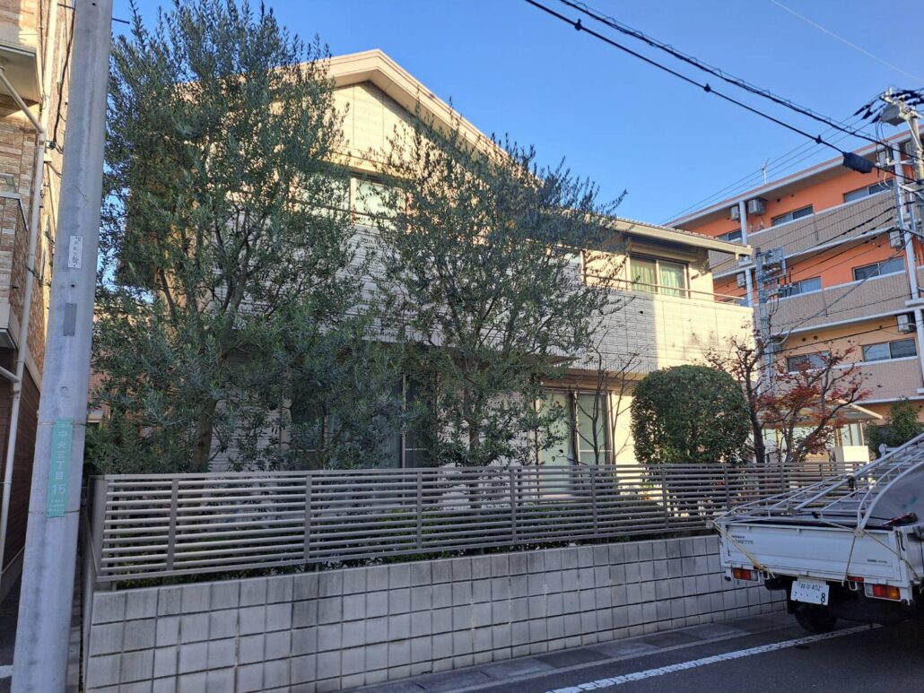 現地を確認すると、外周部から建物まわりにかけて植えられている植栽が健康的に育っている一方で、オリーブ系の常緑樹を中心に枝葉のボリュームが前面に出ており、外壁や窓、フェンス付近まで枝が張り出している箇所が見受けられました。