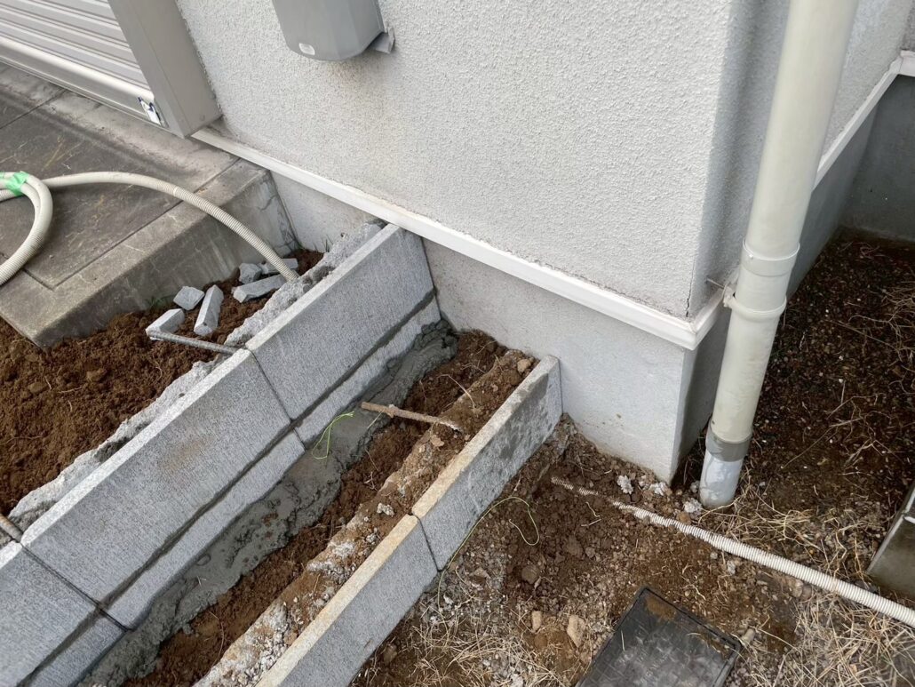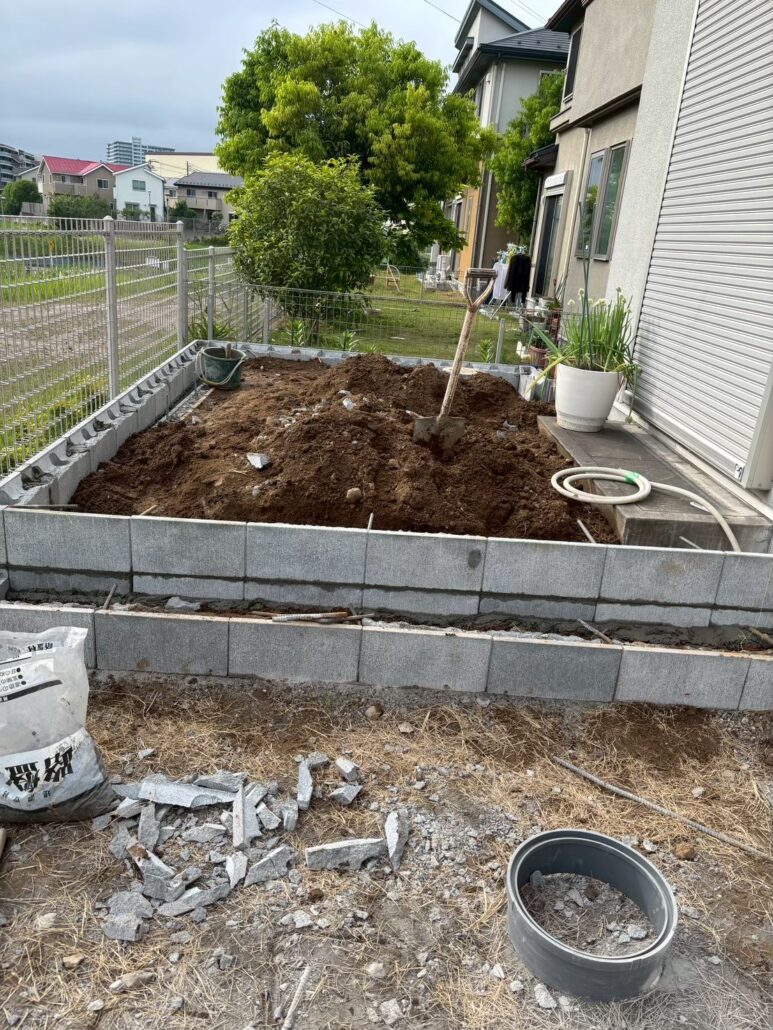 土留めを兼ねた2段階のブロック積みを行い、しっかりとした基礎構造を形成。