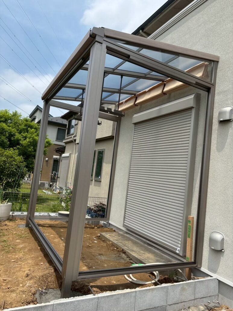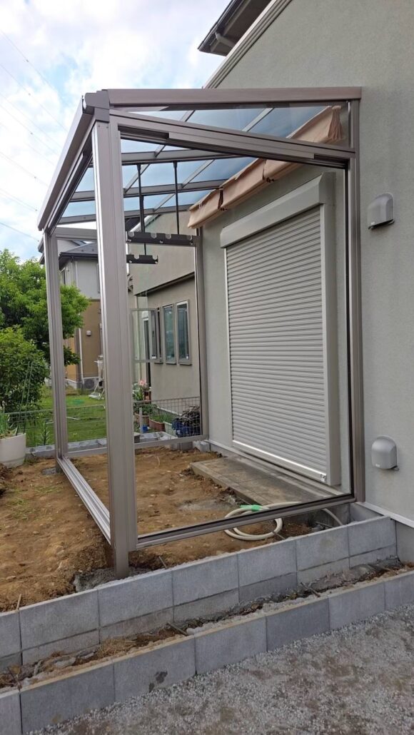 また、建物側にシャッターがあり、ガーデンルームを設置するにあたり、出入り口の位置や室外機・排水管との干渉も考慮する必要がありました。