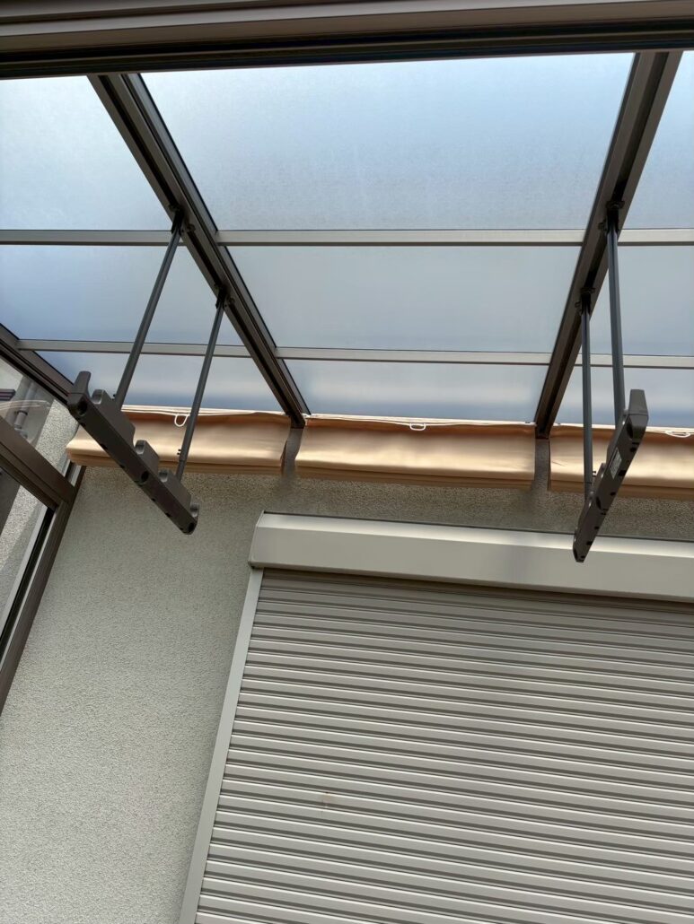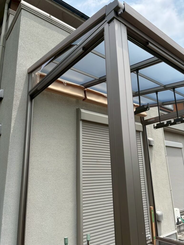 アルミフレームの組立てから屋根パネル・吊り下げ物干しバーの設置までを丁寧に行い、建物との取合いも綺麗に収めました。