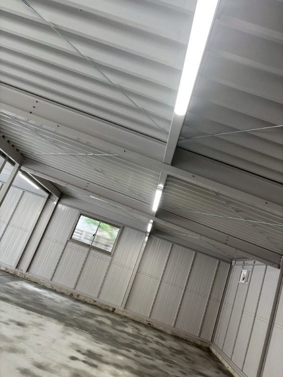 背面側には壁付け換気扇を設置。天井にはLED照明を等間隔に配置し、夜間や曇天時も作業・駐車がしやすい明るさを確保しています。