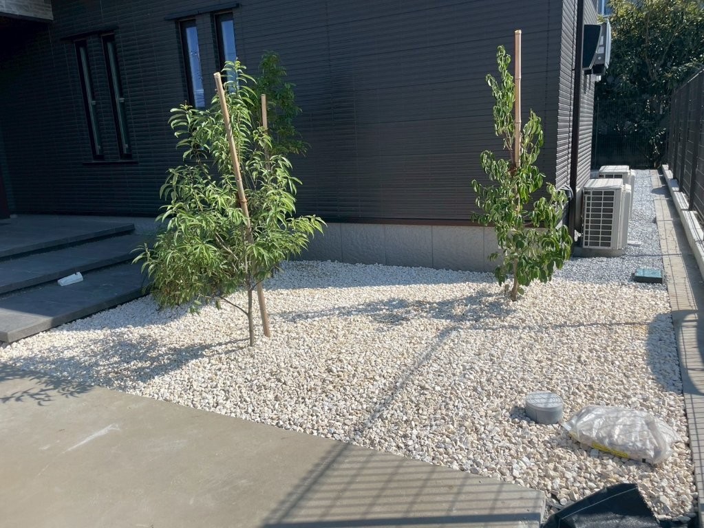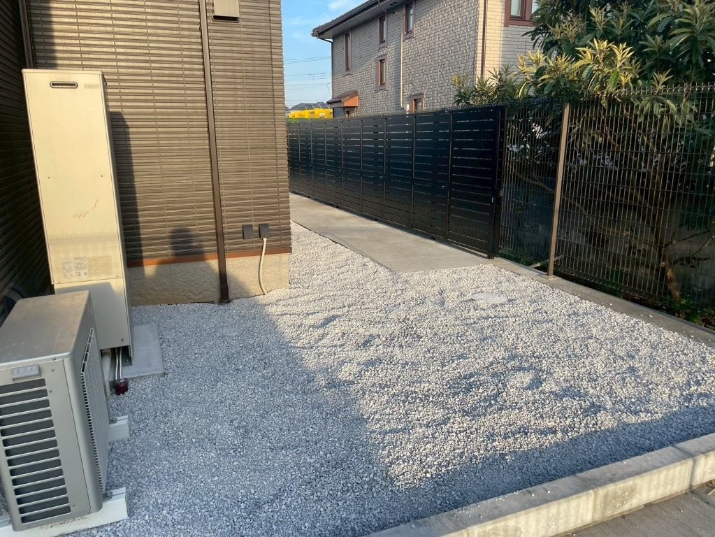 【ガーデン工事】防草シート+化粧砂利+植栽+LIXILフェンスで快適な庭空間へ|三郷市S様邸の外構工事