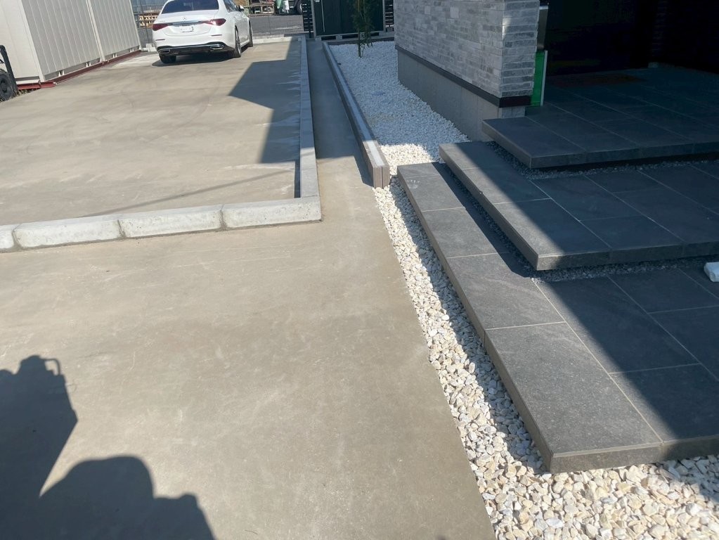 自然石の風合いを持つ舗装材によって、歩きやすさとデザイン性を両立し、玄関まわりがより高級感のある表情に仕上がりました。