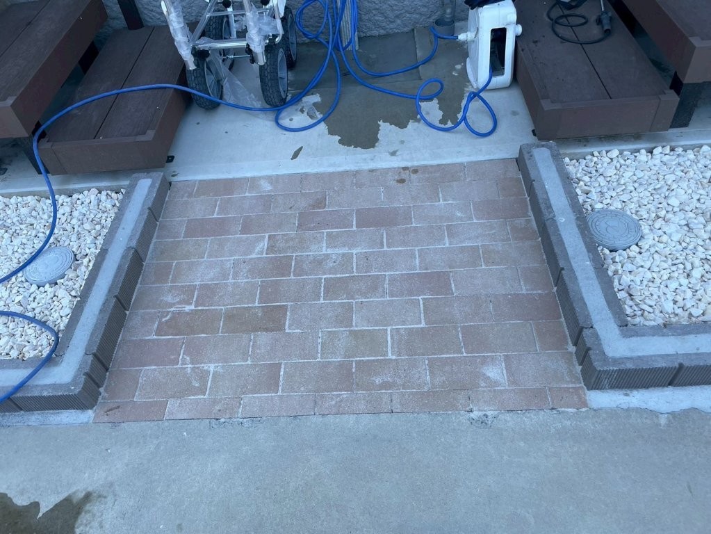 さらに、アプローチ部分にはエスビックの「ロシェナチュラル」を用いたインターロッキングを施工。