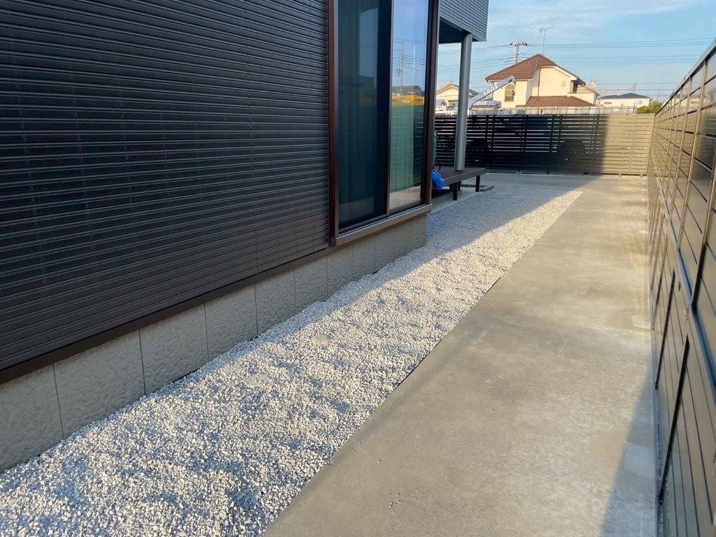 陽の光を浴びて明るく輝く砂利は清潔感があり、外観全体を上品に引き立てています。