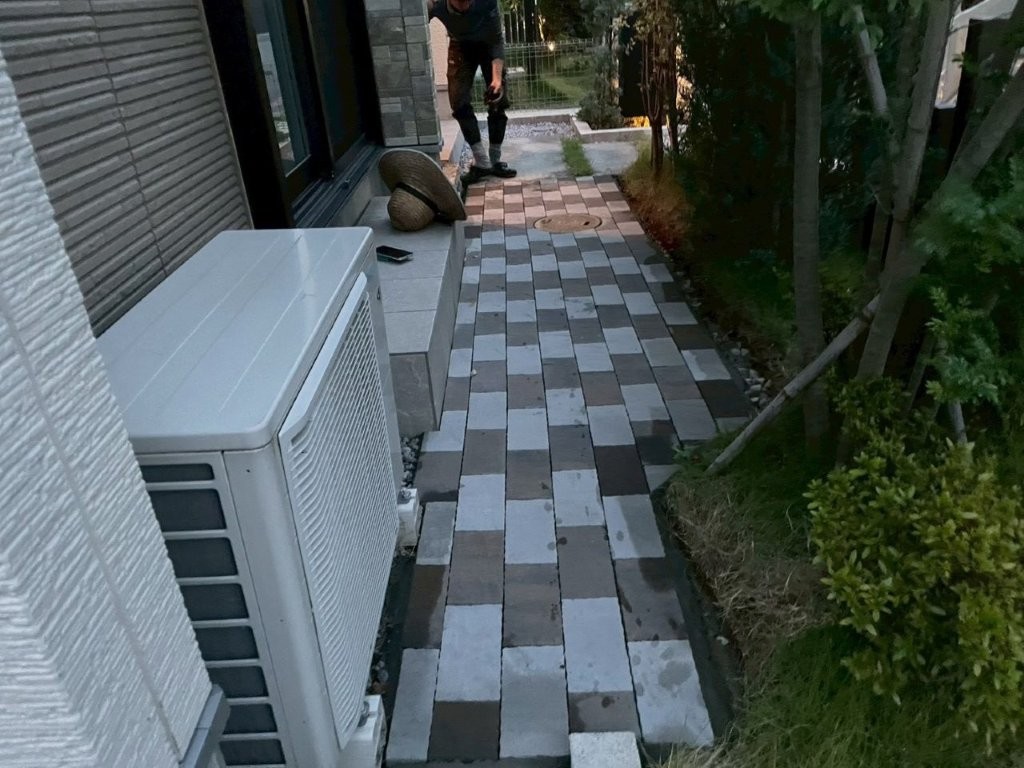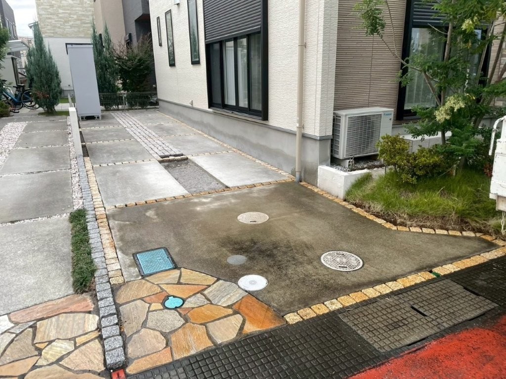 点検マスや室外機まわりも、将来的なメンテナンスを考慮した納まりで施工。見た目だけでなく、長く使うことを前提とした外構設計です。