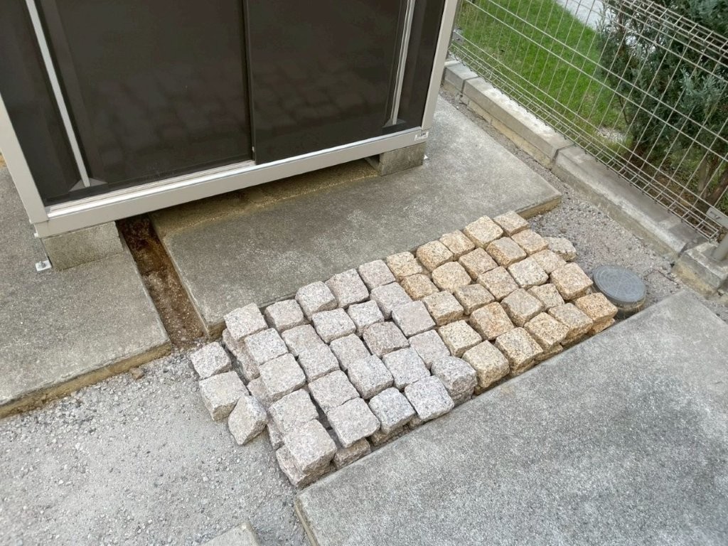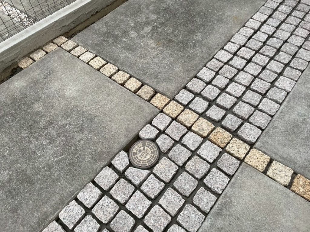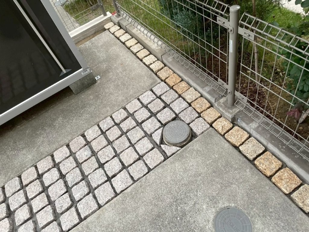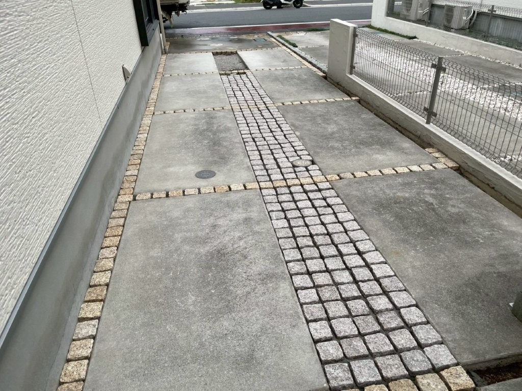 今回のH様邸でも、駐車場の土間コンクリート自体は良好な状態だったため、撤去は行わず、雑草が発生していた目地部分にピンコロ敷きを施工しました。