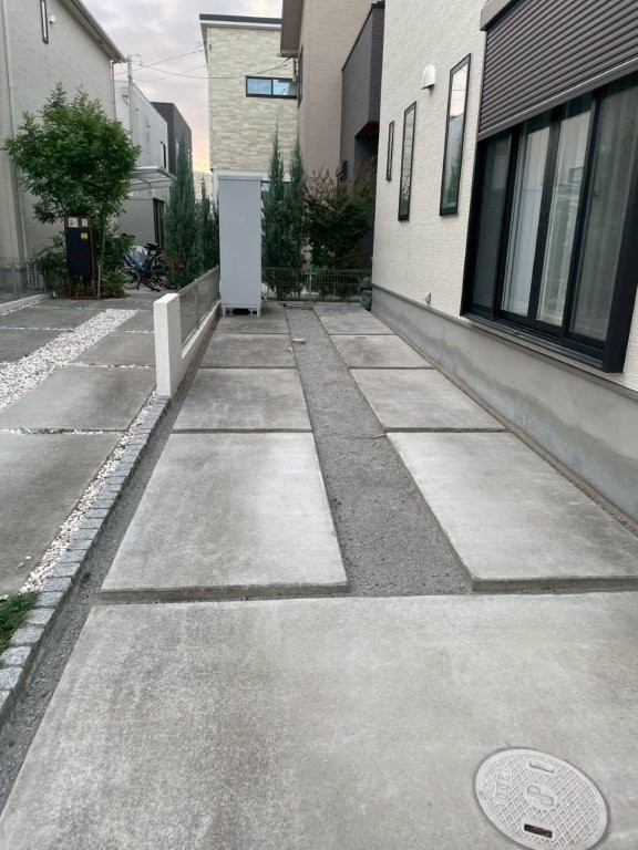 ぬかるみやすかった庭・建物脇の通路が、雨の日でも歩きやすく、汚れにくい動線へと改善。掃き掃除や水洗いも簡単になり、日常管理が楽になります。