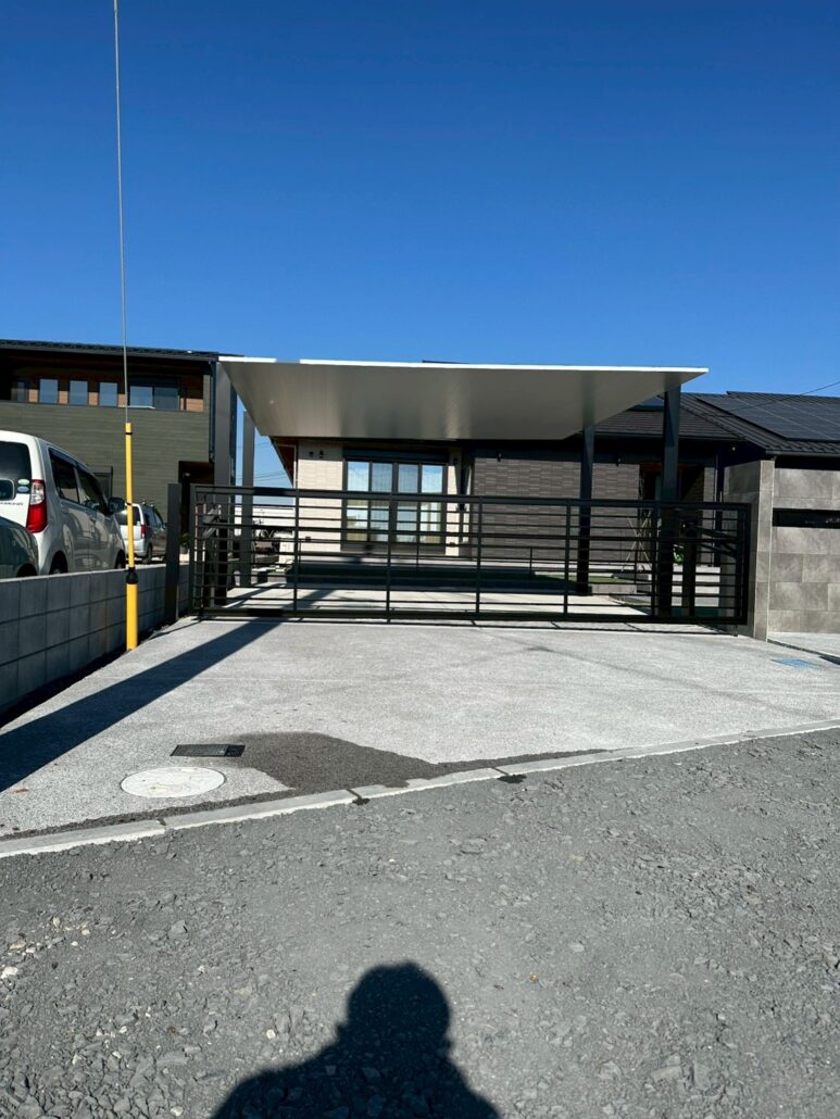 施工後は、LIXILカーポートSCを中心に、建物と外構の水平ラインがきれいに揃った駐車スペースが完成しました。