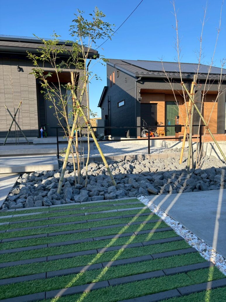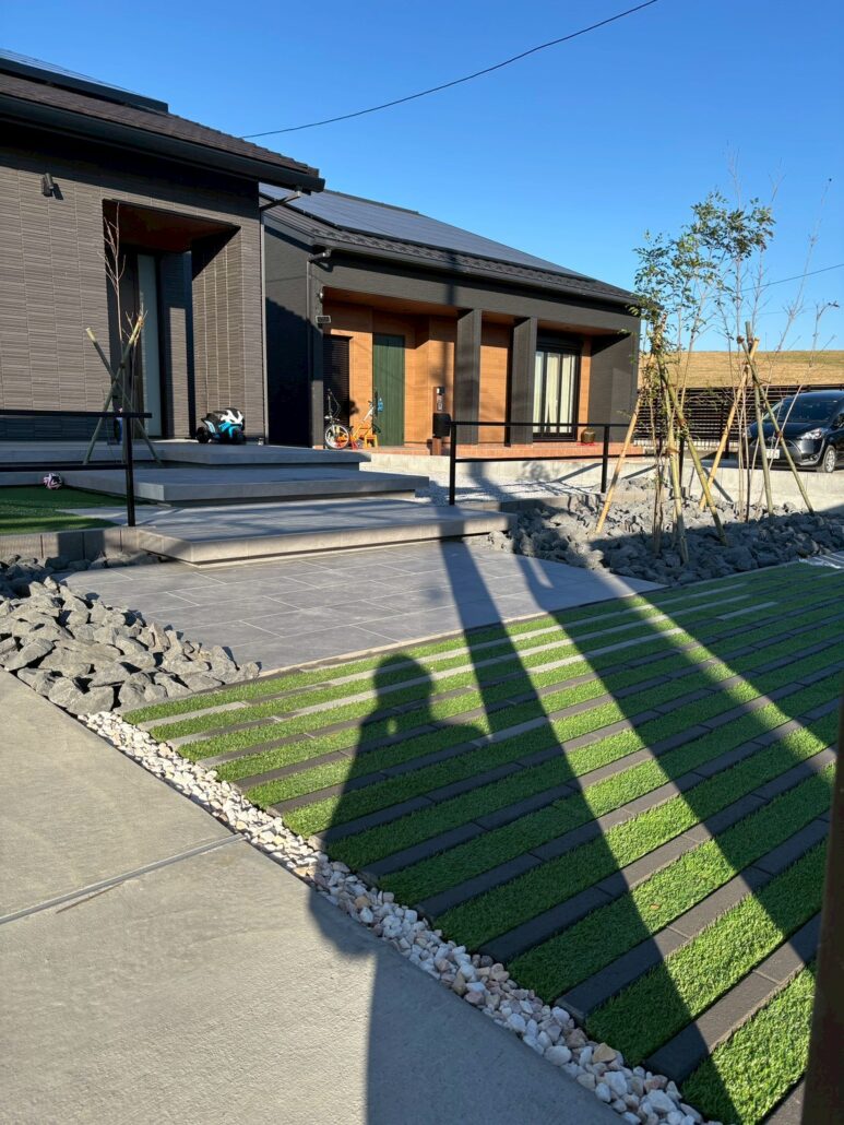 建物外観のダークトーンのシックなデザインに合わせ、外構全体も色味や素材感が統一された、モダンで上質な仕上がりとなりました。