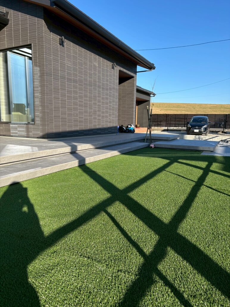 人工芝とタイルデッキ、植栽まわりは下地や納まりが丁寧で、将来的なメンテナンス性にも配慮。