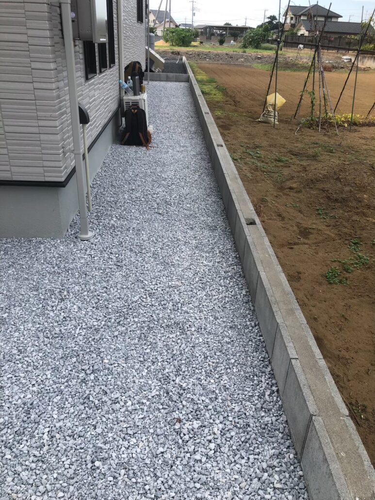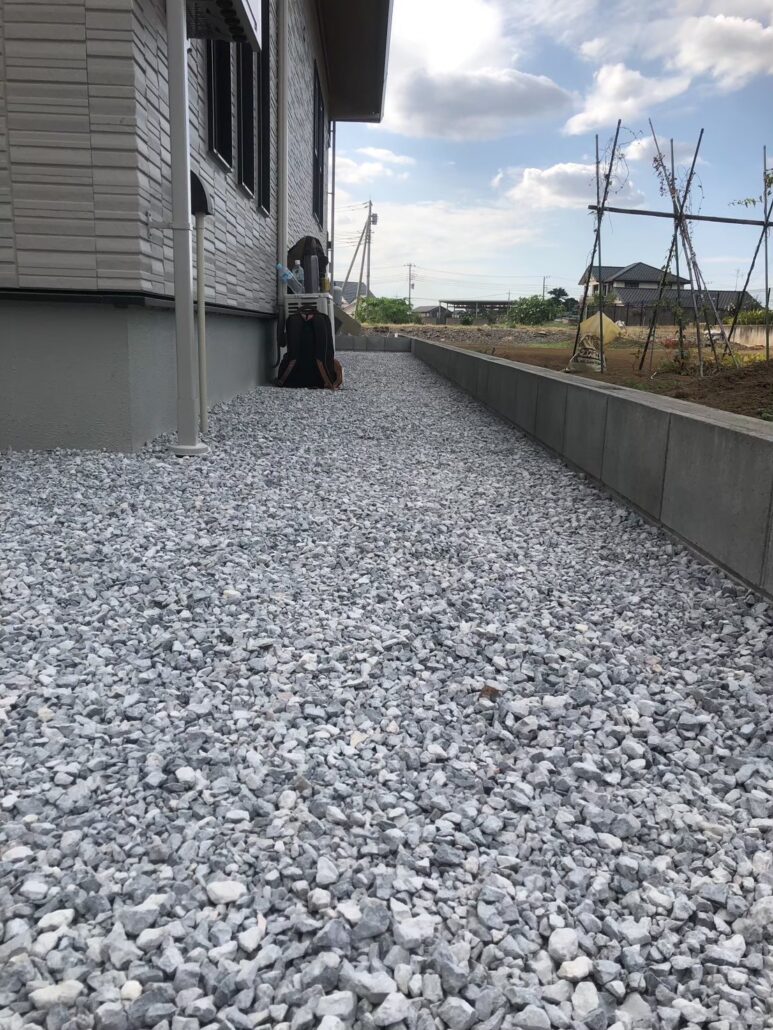建物基礎沿いは全面を砕石敷きで統一。
